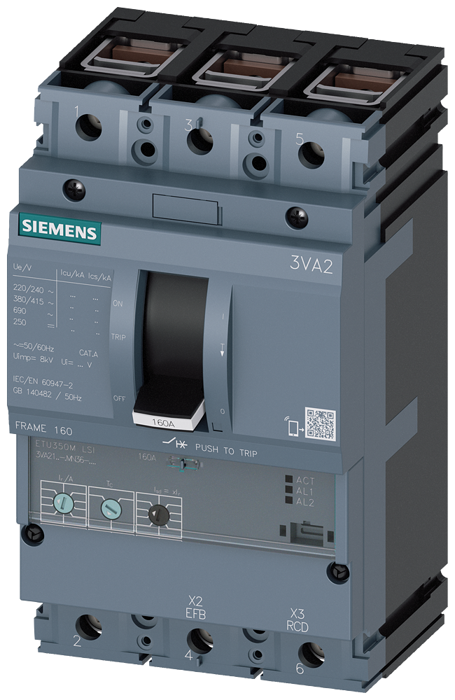 Interruptor automático 3VA2 IEC BASTIDOR 160 Clase de poder de corte M Icu=55kA @ 415V 3 polos, protección de motor ETU350M, LSI, In=100 A protección de sobrecarga Ir=40 A...100 A protección de cortocircuito Isd=3...15 x Ir, Ii=15 x In conexión en borne Interruptor automático de caja moldeada 3VA2 con ETU serie 8 para protección de distribuciones. Los interruptores automáticos de caja moldeada 3VA de Siemens, una parte importante de los componentes de protección SENTRON para aplicaciones industriales y del sector de las infraestructuras, ofrecen protección eficaz para instalaciones, arrancadores y motores gracias a la desconexión segura en caso de sobrecarga y cortocircuito. Los interruptores automáticos de caja moldeada 3VA son modélicos en cuanto a flexibilidad y a variedad de accesorios modulares. Accesorios unitarios para varios tamaños y para todas las series de los interruptores automáticos de caja moldeada 3VA1 y 3VA2. Esta variante del interruptor automático de caja moldeada 3VA se caracteriza especialmente por: 1. Diseño compacto. 2. Disponible como variante para protección de distribuciones y generador. 3. Disponible en versiones de 3 y 4 polos. 4. Cuatro clases de poder de corte de 55 kA a 150 kA con 415 V. 5. Dependiendo del tamaño: Intensidad asignada 25 A.630 A. 6. Modelos para montaje fijo, enchufable y extraíble. 7. La serie dispone de un disparador electrónico de sobreintensidad. 8. Con display integrado para la visualización de valores medidos. 9. Función de medida integrada y conexión opcional de comunicación a través de Modbus TCP, Modbus RTU, PROFINET y PROFIBUS. 10. Gama modular de accesorios internos con diversas funciones y fáciles de montar.