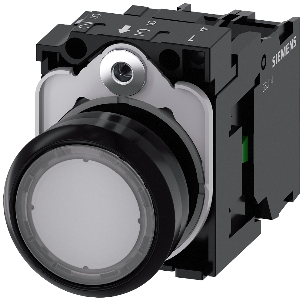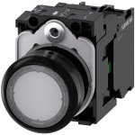 pulsador luminoso, 22 mm, redondo, plástico, transparente, botón, rasante, momentáneo, con soporte, 1 NA, módulo de LED con LED intgr. 230 V AC, borne de tornillo Pulsador luminoso SIRIUS ACT para maniobra y mando de consumidores eléctricos.Bajo la marca SIRIUS ACT Siemens ofrece una gama, íºnica en su género, de aparatos de mando y señalización homologados en todo el mundo. Consta de tres modernas series de diseño con modelos de robusto metal macizo y de plástico de alta calidad.El innovador sistema de fijación por abroche simplifica el montaje hasta el punto de que basta una sola mano y no se necesitan herramientas especiales. Pueden fijarse en simples taladroscirculares sin ranura, ya que incorporan una protección antigiro plenamente efectiva.Gracias a su alto grado de protección uniforme, todos los aparatos robustos son aptos para aplicaciones industriales e instalación a la intemperie. Incluso resisten la limpieza con chorro de agua a alta presión. Su funcionamiento fiable tampoco es afectado por el polvo, los aceites o bases agresivas.Además de por cableado convencional, los aparatos también pueden conectarse al controlados vía bus PROFINET, AS-Interfaceo IO-Link. Así se reduce el tiempo y el esfuerzo dedicado al cableado, se minimizan las fuentes de error y se gana en flexibilidad.Este programa gráfico online facilita al máximo la selección y pedido de componentes, unidades, cajas e inscripciones. Extensa documentación (p. ej. manual, datos 3D, diagrama de conexión) disponible.Versiones disponibles: varios colores, con iluminación o sin ella, con rotulación o sin ella, con mando sostenido o momentáneo y con distintas alturas de botón y anillo frontal.Nota: Unidad compacta, incluyendo soporte y módulos.SIRIUS ACT - Performance in Action en operaciones de mando y señalización Simples de montar, simplemente superiores, simplemente perfectos.